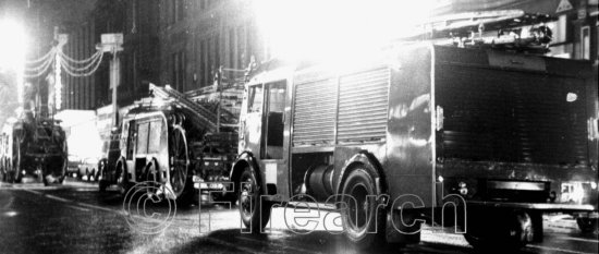 Callers Department Store fire, Northumberland Street, Newcastle in December 1969. Northumberland County Fire Brigade sent six engines to this fire. Lined up here are machines from Wallsend, and Gosforth. This incident was the biggest blaze in the brigades twenty-six year history.