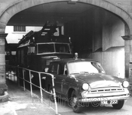 Gosforth fire station in 1968. The station officers Commer Cob utility van and the pump escape have been placed at the top of the archway whilst contractors repair the roof of the council chambers.