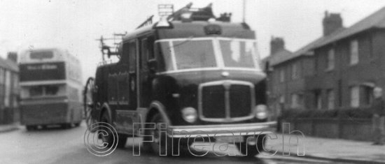 HVK478D Newcastle’s last Merryweather Marquis pump was this pump escape assigned to Headlam Street, Byker in 1966. It was a late order to replace a similar appliance that was written off in a road accident. It was captured at a fifteen pump fire at Callers Store, Northumberland Street on a bitterly cold December in 1969.