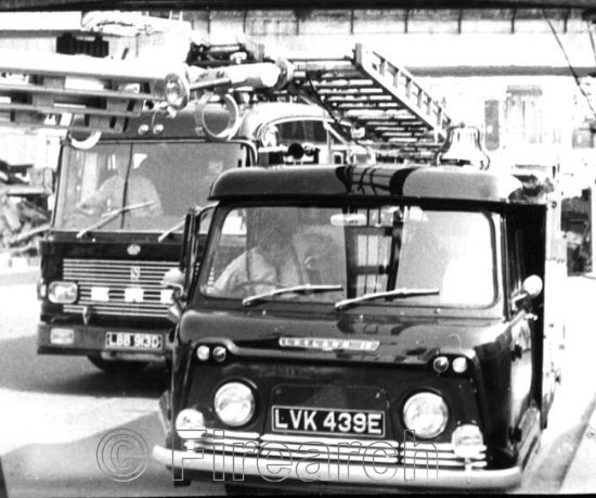 KVK694D, one of the two ill fated mini fire engines has just arrived at a derelict house fire at George Street, Elswick in 1967. The chassis was a Leyland 20 cwt and the bodywork was by the local firm of Minories. Both appliances were designed to the requirements of C.F.O. Noble of Newcastle & Gateshead Joint Fire Service.