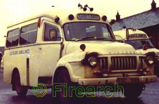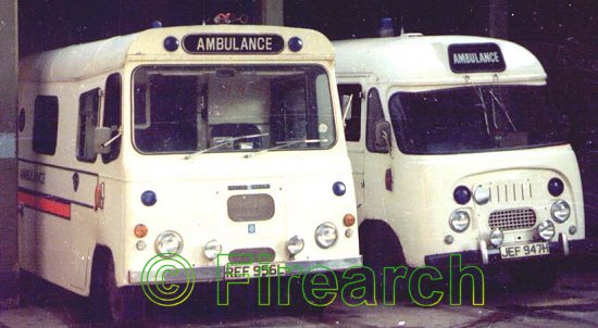 Hartepool Ambulance Depot in 1976 showing a BMC LD series Appleyard ‘Statesman’ ambulance and a newer Leyland EA /Reeves vehicle. The service had recently merged becoming part of Cleveland A.H.A.